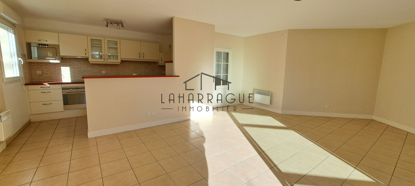 Il se présente ainsi : une entrée avec placard, un séjour double de 33 m2 donnant sur une terrasse ensoleillée de 9 m2, une cuisine ouverte complètement aménagée et équipée.